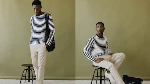 กางเกงชิโน่เป็นทางเลือกที่ดีเมื่อคุณต้องการสร้างภาพลักษณ์แบบเรียบง่ายแต่ดูดี เสื้อยืดลายทางจะช่วยเพิ่มสีสันให้กับชุด และยังเหมาะสำหรับการทำงานหรือกิจกรรมทางธุรกิจ