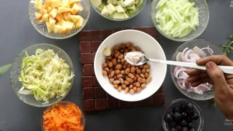 เริ่มต้นด้วยการล้างผลไม้ให้สะอาด จากนั้นหั่นแอปเปิลสาลี่เป็นชิ้นเล็กๆ และฝรั่งเป็นชิ้นบางๆ ใส่ลงในชามผสม เติมน้ำมะนาวเพื่อป้องกันไม่ให้ผลไม้เปลี่ยนสี จากนั้นเติมน้ำมันมะกอก เกลือ และพริกไทยตามใจชอบ คลุกเคล้าให้เข้ากันแล้วเสิร์ฟทันที