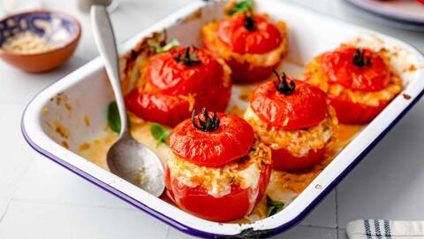 มะเขือเทศยัดไส้ข้าวสมุนไพร เสิร์ฟคู่โยเกิร์ตเครื่องเทศ