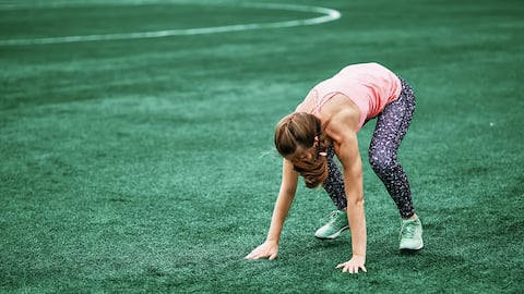 เมื่ออยู่ในท่ายืนตรง งอเข่าและวางมือทั้งสองข้างลงบนพื้น จากนั้นกระโดดกลับไปในท่าแพลงค์ โดยรักษาร่างกายให้ตรงและมั่นคง อย่าให้สะโพกยุบหรือยืดยาวเกินไป การรักษาท่านี้จะช่วยเสริมสร้างกล้ามเนื้อแกนกลางและแขน