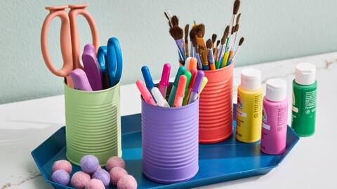 กระป๋องโลหะหรือพลาสติกที่เคยใช้บรรจุอาหารสามารถทำความสะอาดและนำมาใช้เก็บปากกา ดินสอ หรืออุปกรณ์สำนักงานอื่นๆ ได้อย่างดี เพียงแค่ล้างให้สะอาด ตกแต่งด้วยสีหรือสติ๊กเกอร์ตามใจชอบ คุณก็จะได้ที่เก็บของที่ดูดีและมีประโยชน์
