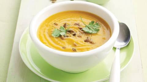 ซุปฟักทองบัตเตอร์นัทรสเผ็ด โรยเมล็ดผักชีคั่ว